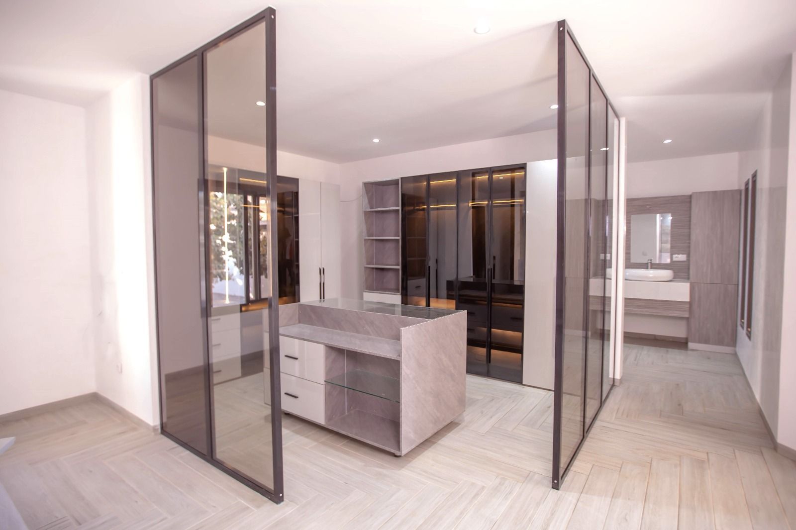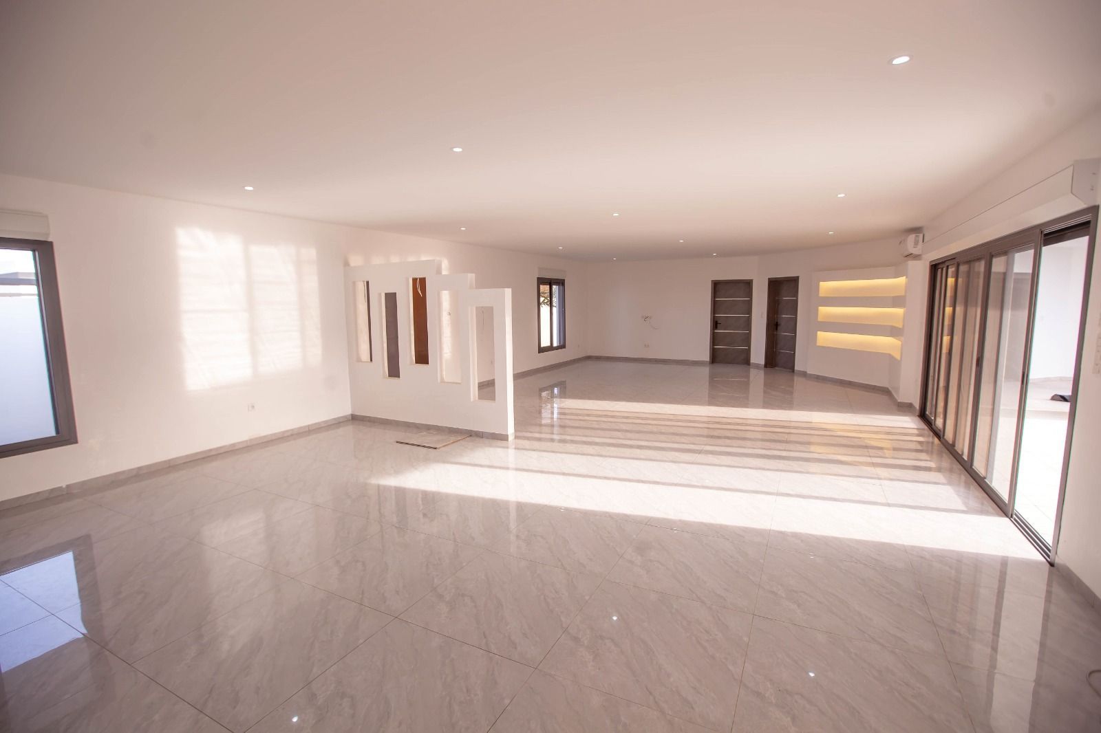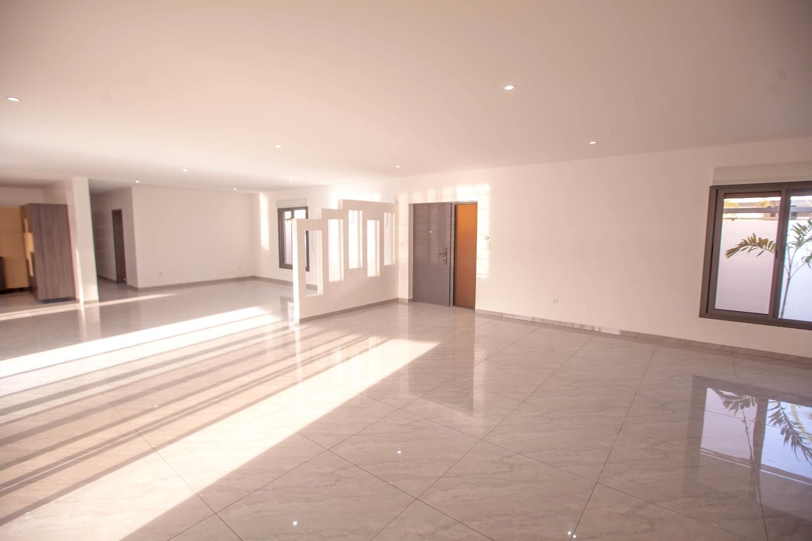 Un grand salon avec cuisine américaine, un bureau et une salle de sport pour la villa avec 4 chambres.